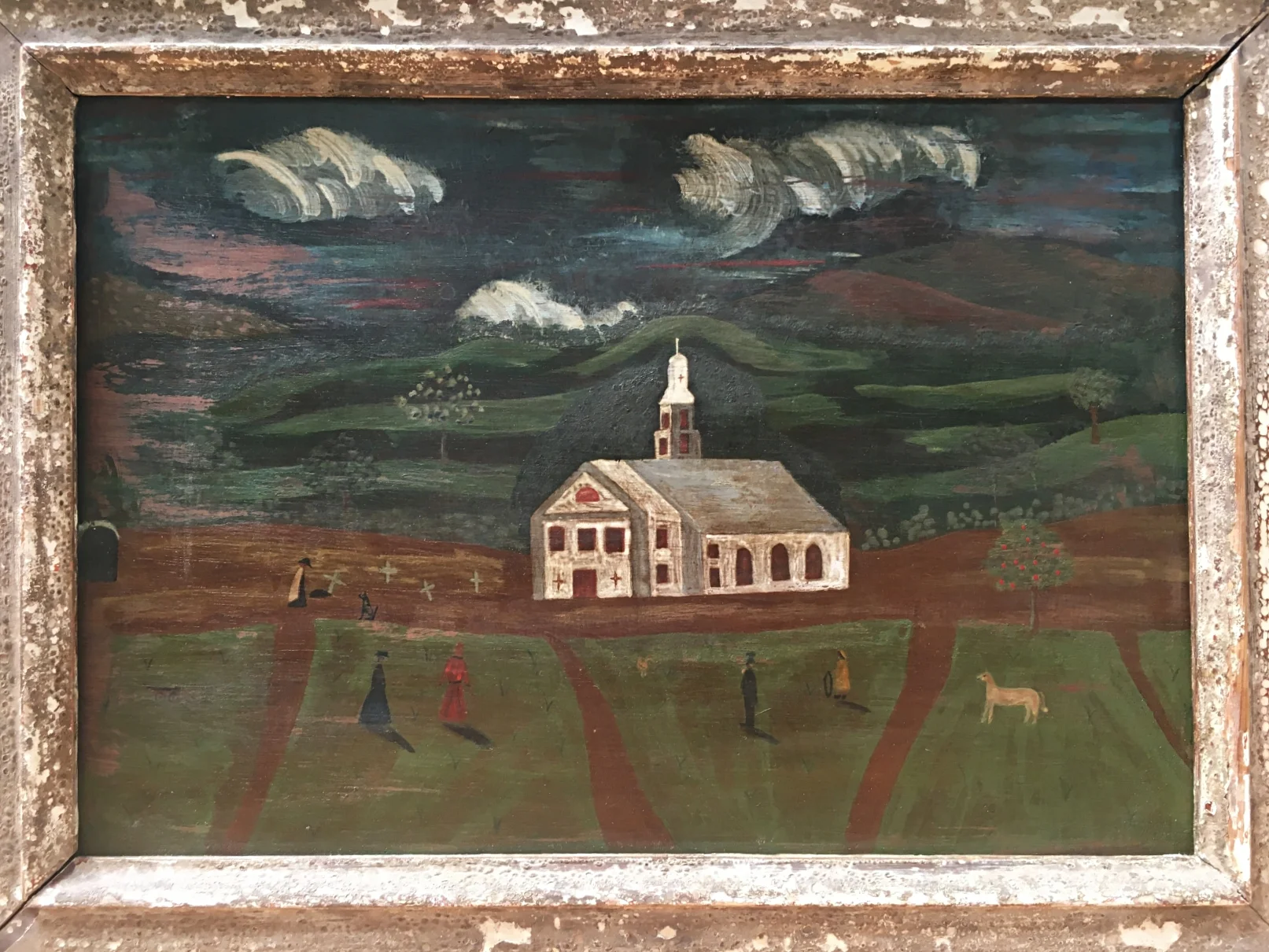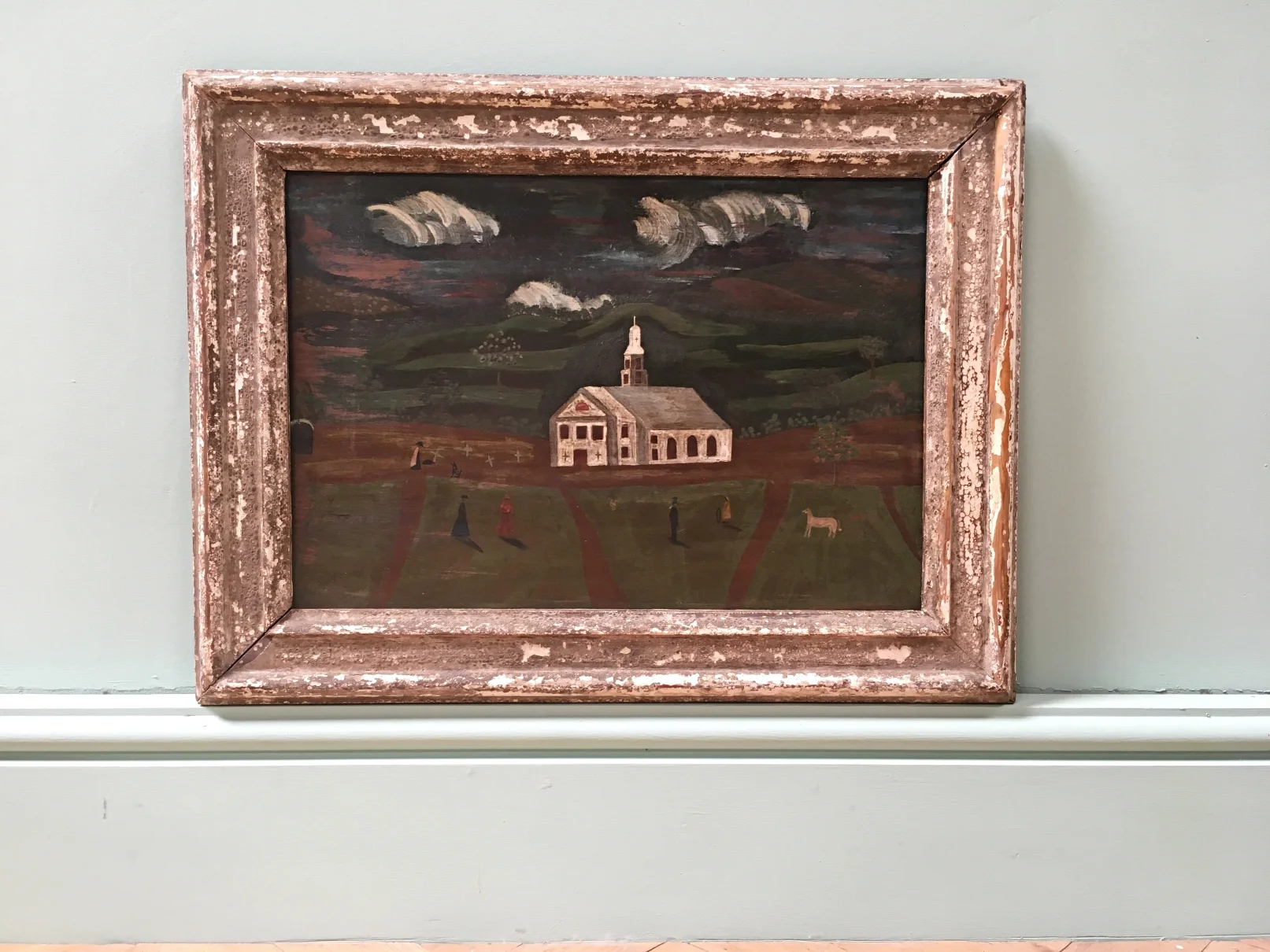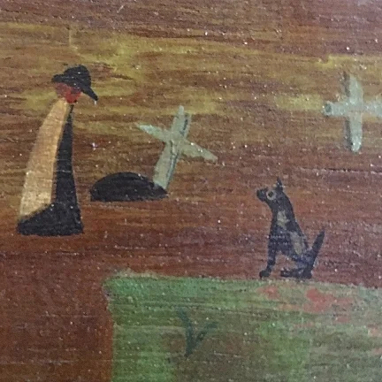 A very faint ladder left leaning against a single apple tree is just one of many charming details depicted by the anonymous artist.